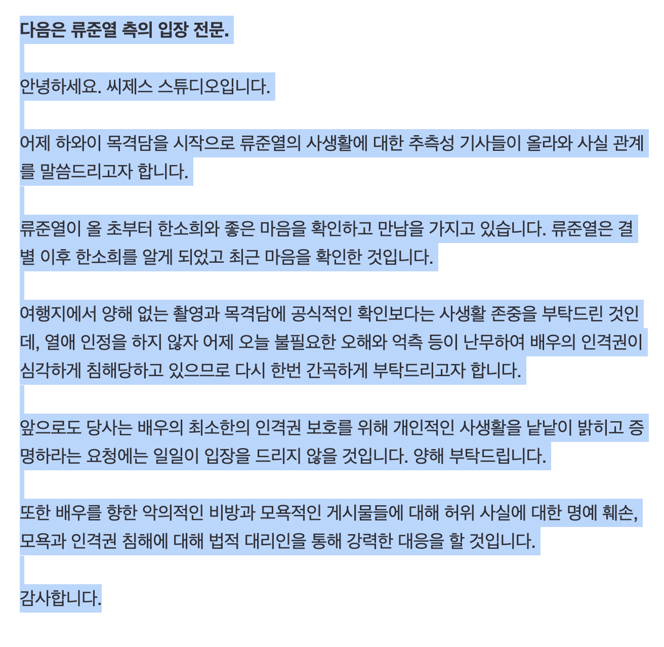4.2024년 3월 16일 한소희 열애 공식 인정 및 혜리 에게 사과 / 류준열 측 소속사 입장문